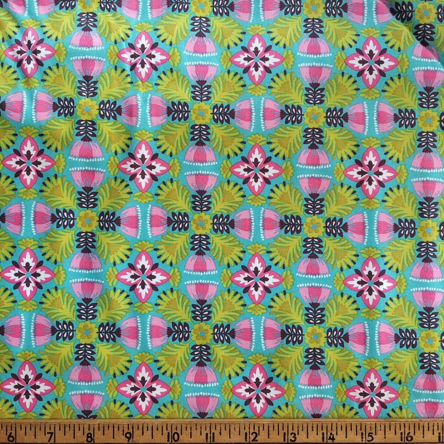 Large flowers in pink and citron green on a teal background, from the Lottie collection by Maude Ashbury for Blend Fabrics, 45", 100% cotton