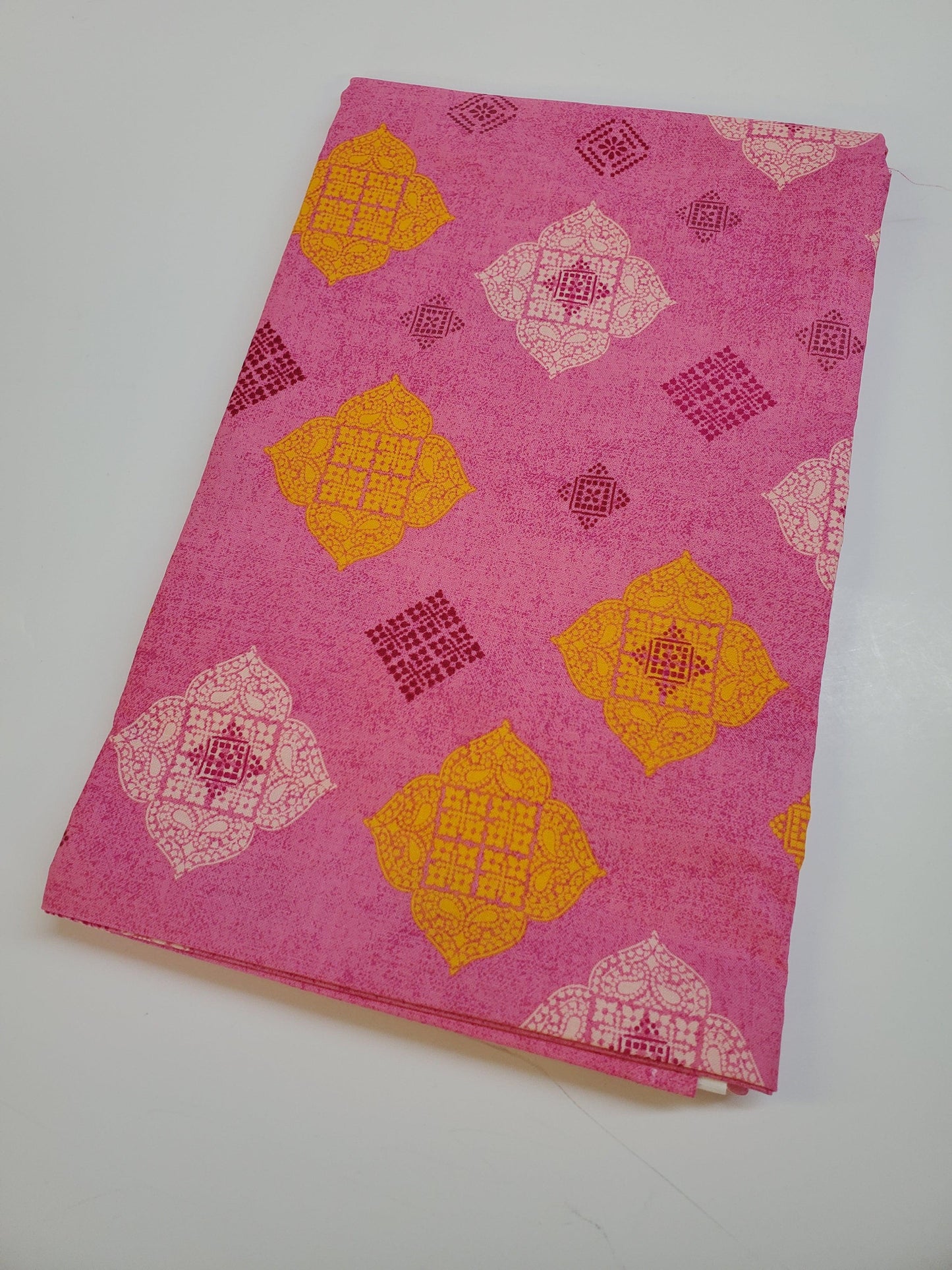 The Awaken Medallion Pink is a 100% cotton quilting fabric featuring a unique geometric print. The Awaken collection fabric is made of Boundless fabric that provides superior durability. Its pink and white color combination provide an elegant look, adding a touch of sophistication to your project. 100% Cotton, 44" / 45" Wide Quilt Fabric, Sold by the yard.