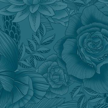 Collage Floral Deep Lagoon, from Boundless' Collage collection, is a 100% cotton quilting fabric. It features a tonal line art style, using black lines and shading against a subtle teal background with a large floral print for a unique visual. This fabric is the perfect choice for any project requiring a stand-out aesthetic.