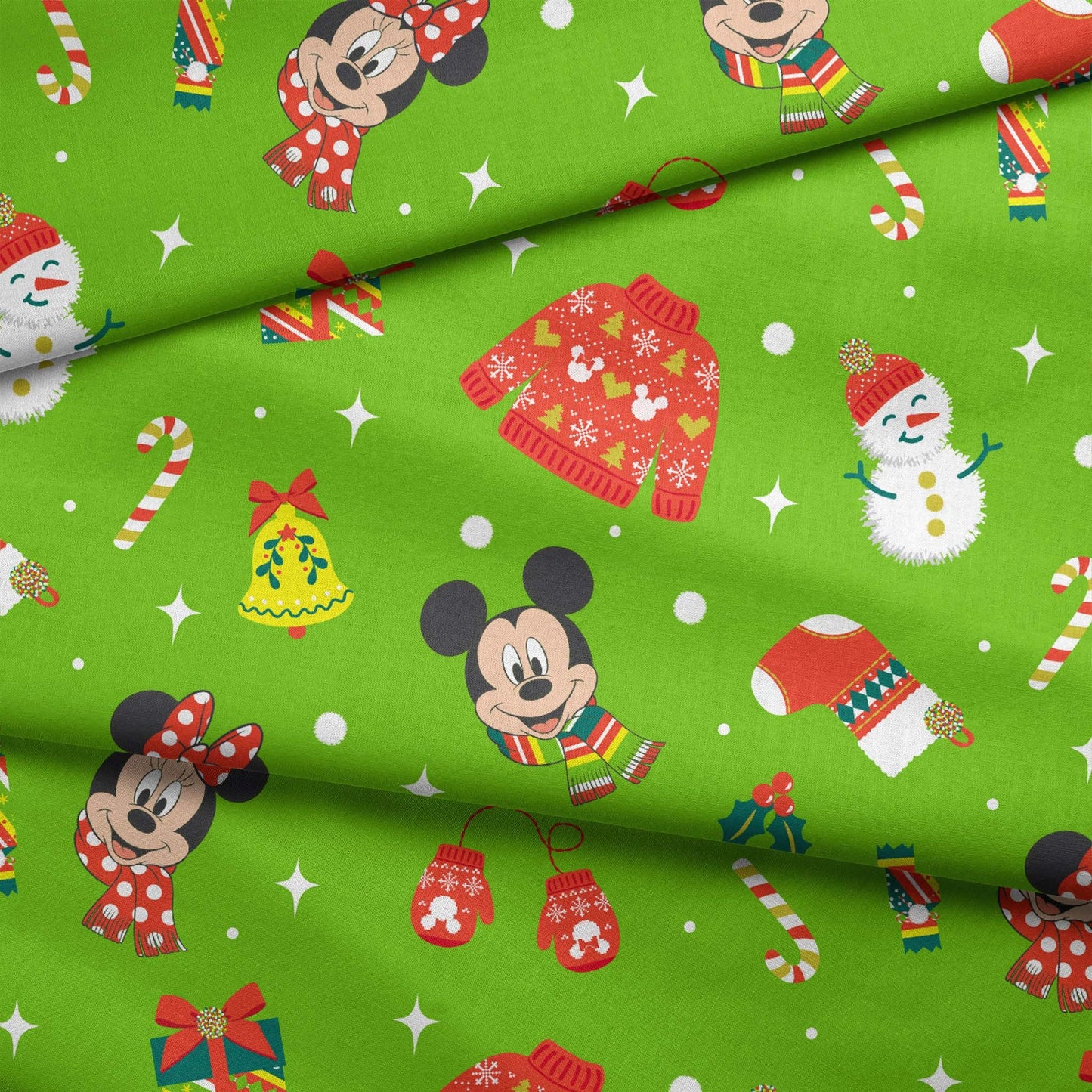 Infuse your holiday creations with Disney magic using this delightful Mickey & Minnie Christmas Holiday Pattern fabric from Springs Creative. Set against a rich green background, this fabric features Mickey and Minnie Mouse adorned in festive attire, surrounded by cheerful holiday elements like snowmen, candy canes, cozy sweaters, and winter mittens. Perfect for adding a whimsical touch to quilts, apparel, home décor, and more.