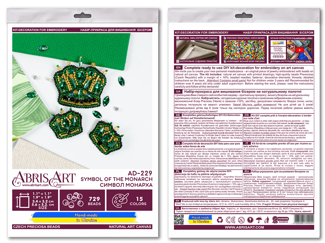 Regular price $29.74Kit contains: Beads, needles, felt, decorative elements, instructions. In each carefully assembled box you will find: a large piece of natural art canvas with a printed image-scheme (fabric for embroidery) arger than the size of the picture - with enough stock to make it convenient to embroider . The world's best beads Preciosa Ornela (Czech Republic), with "stock" , high-quality bead needles from Japan , and most importantly - detailed instructions, the scheme for beadwork with a key, specially developed by our designers for each plot separately and already applied to the canvas. Additionally, it is equipped with microbeads (PRECIOSA No. 13) (2 colors), a needle for embroidery with microbeads, glass decorative stones - rondel shape - 8 pcs., bicone - 2 types (24 pcs.), drop 2 types (10 pcs.), hemisphere - 2 pcs., leaf - 5 pcs. and glass beads - 14 pcs., accessories for making jewelry-brooch - decorative clasp, and detailed step-by-step illustrated instructions for embroidery and further design of embroidered jewelry. Beads 15 colours. Dimensions 6*3cm / 2,64*3,07in. Made in Ukraine.