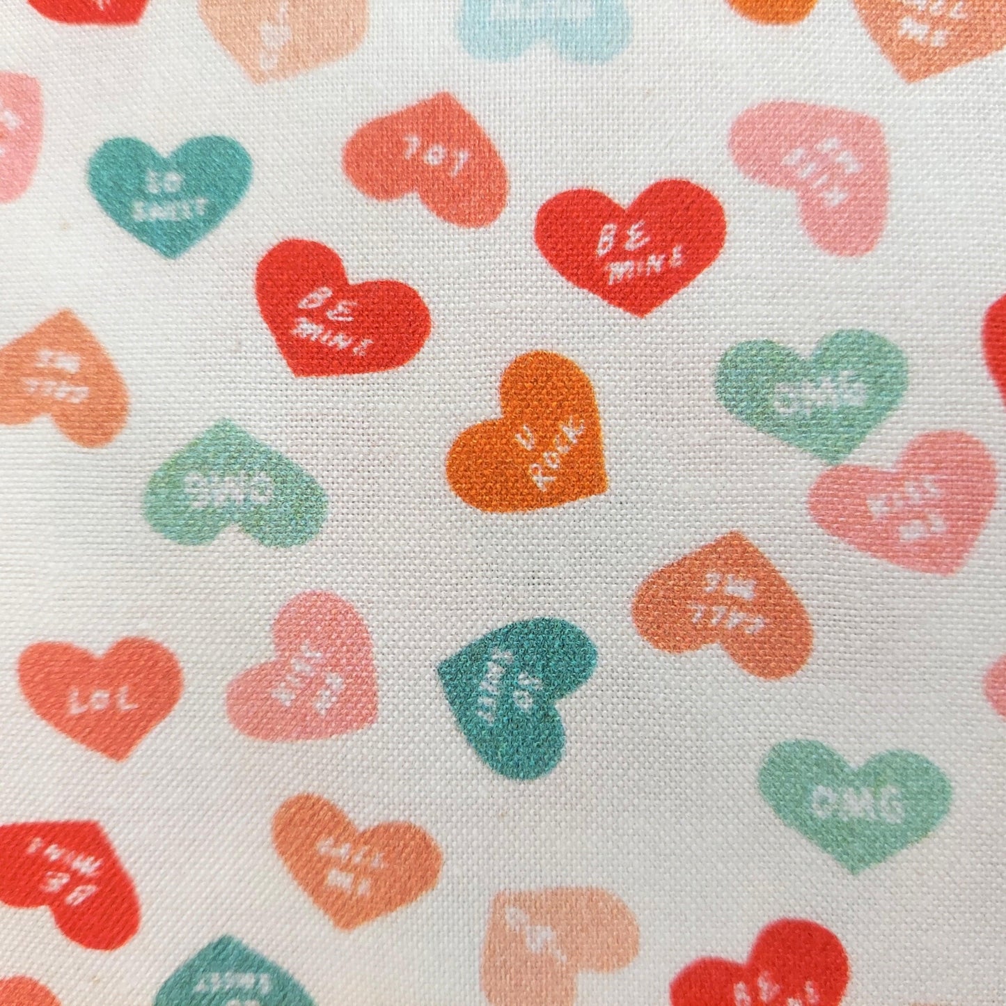 This fabric has a light, near-white but not quite- background with conversation hearts in an all over print.