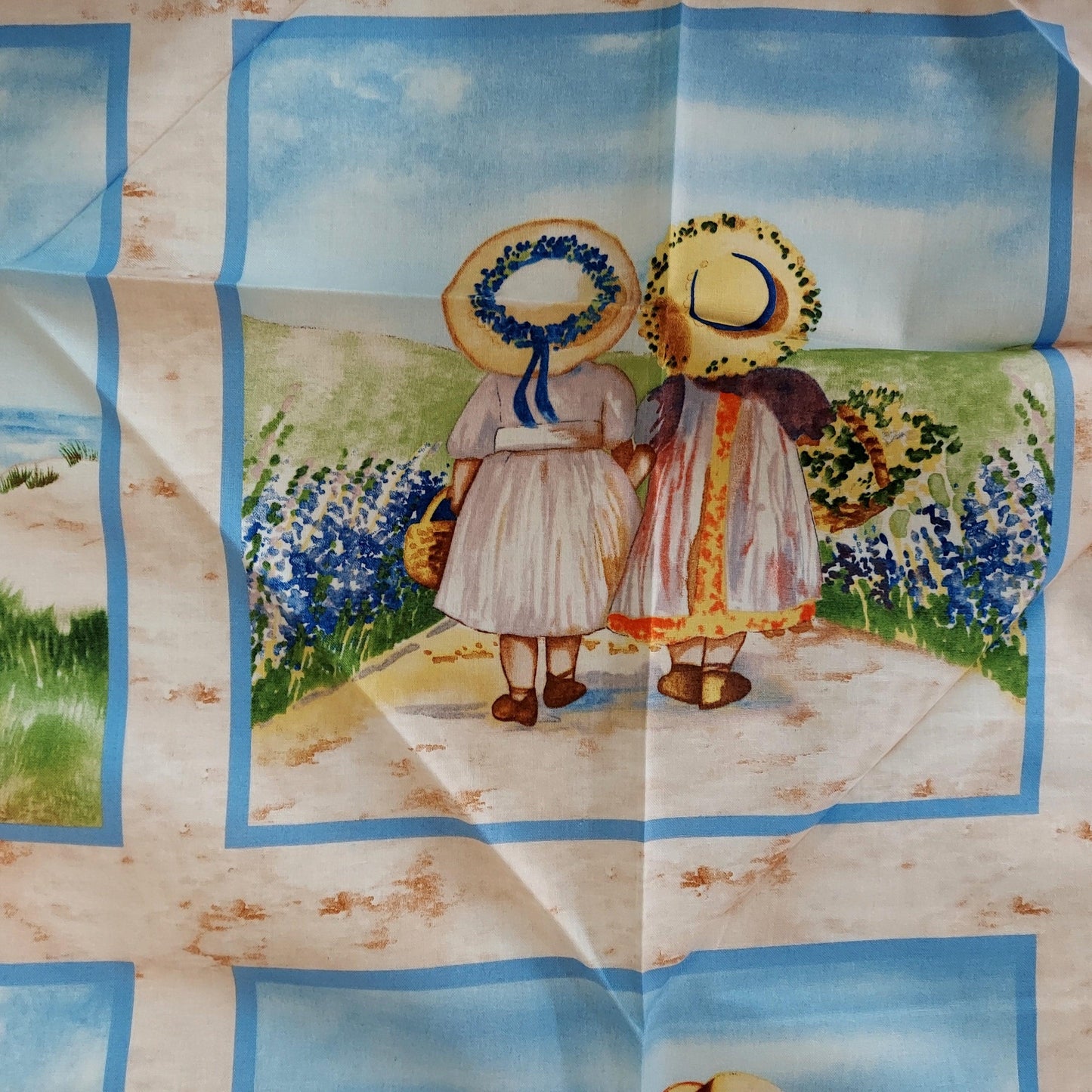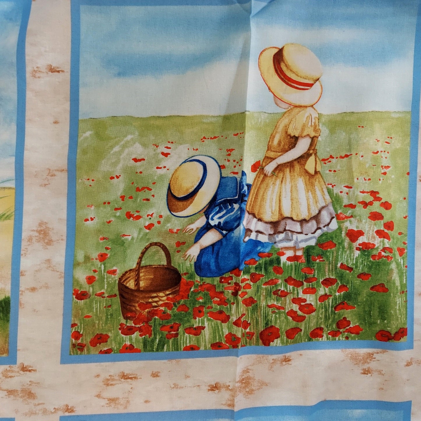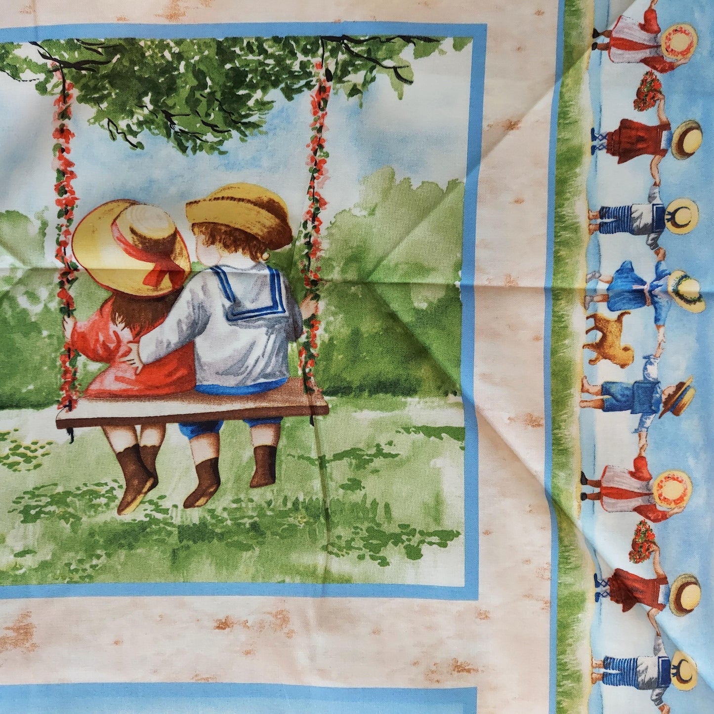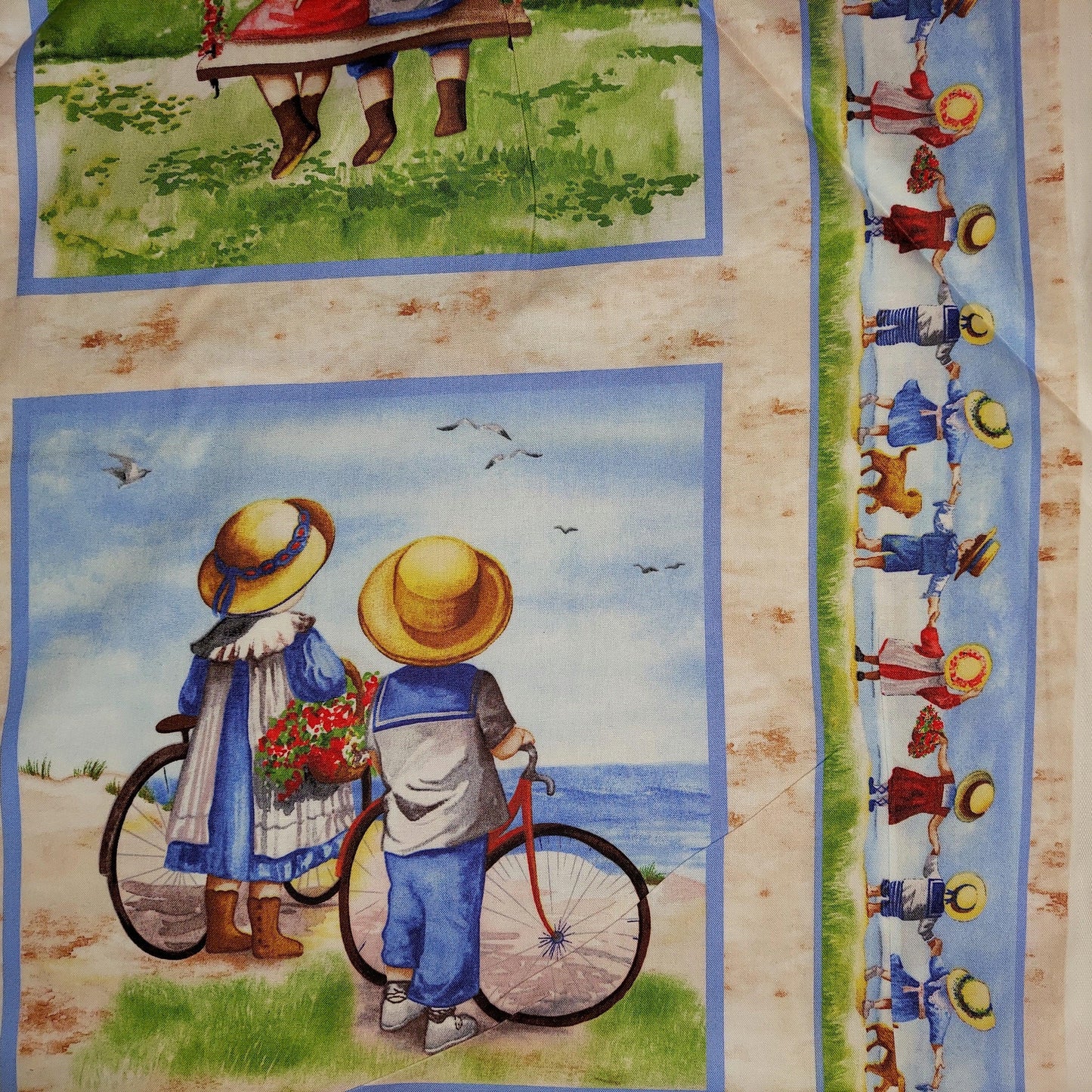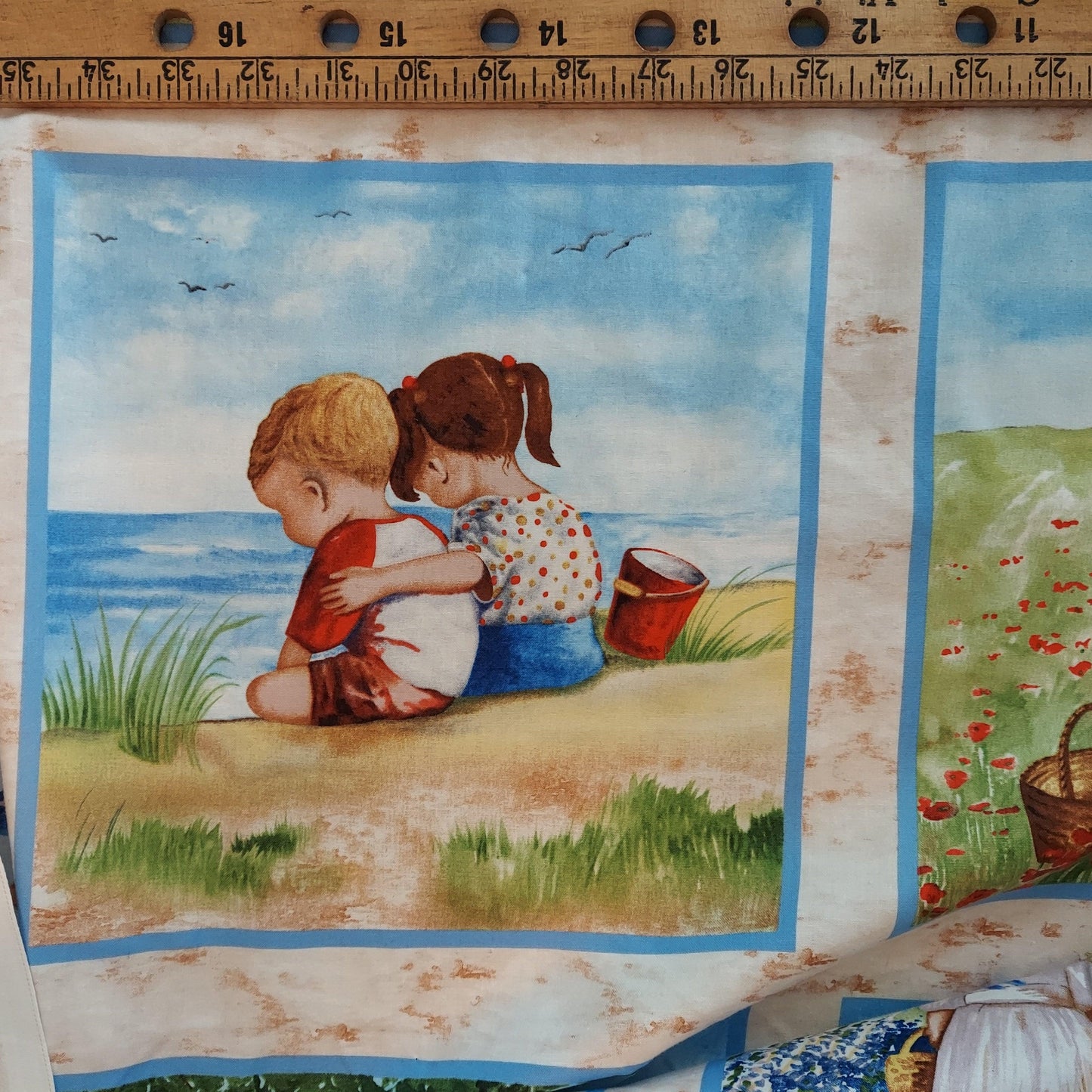 This great cotton broadcloth has beautiful nostalgic scenes of childhood in 10 inch squares, including children in old fashion clothing and straw hats on a swing, watering flowers, walking arm in arm, at the beach, and picking flowers.