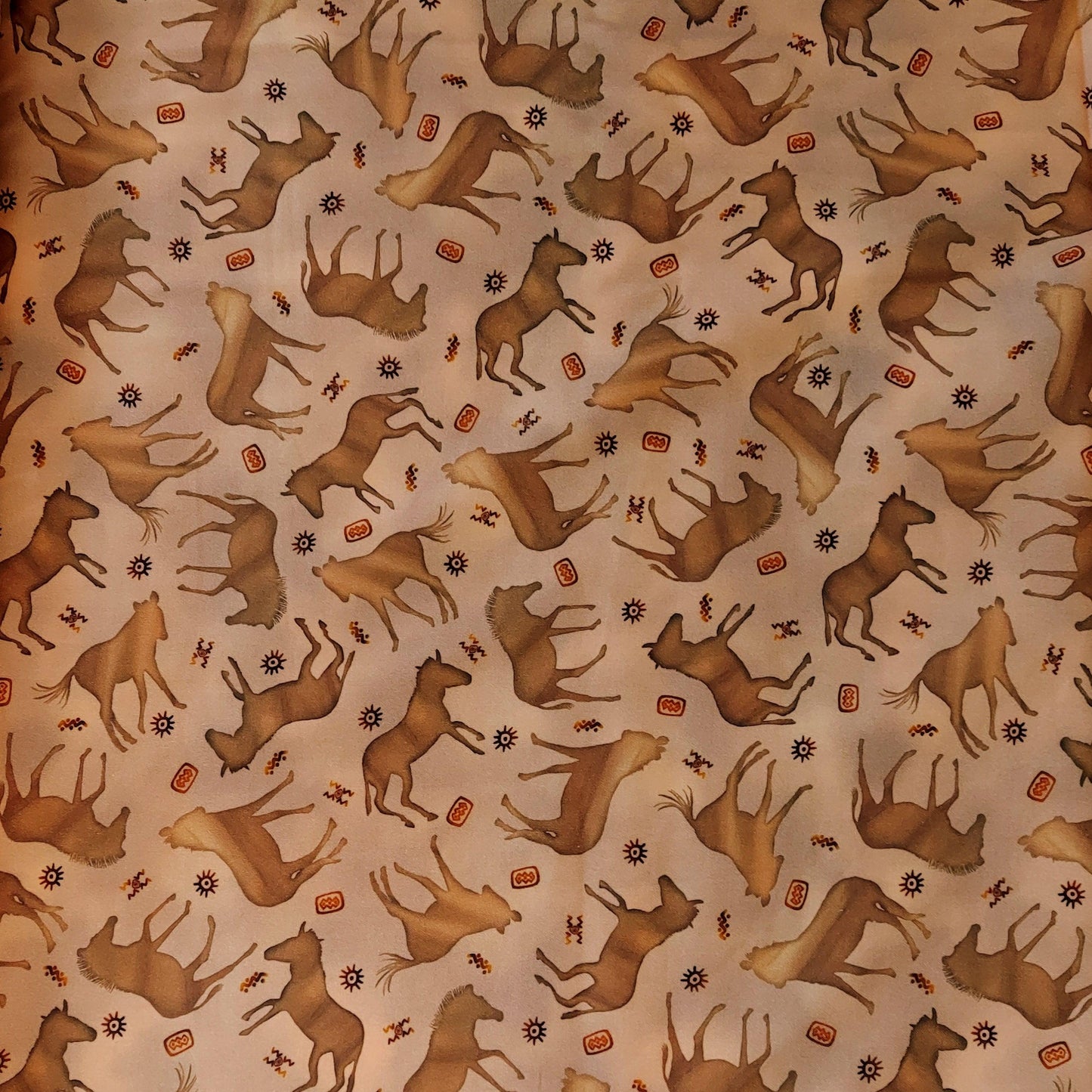 These fabric features silhouettes of zebras (or horses) on a mottled brown background.