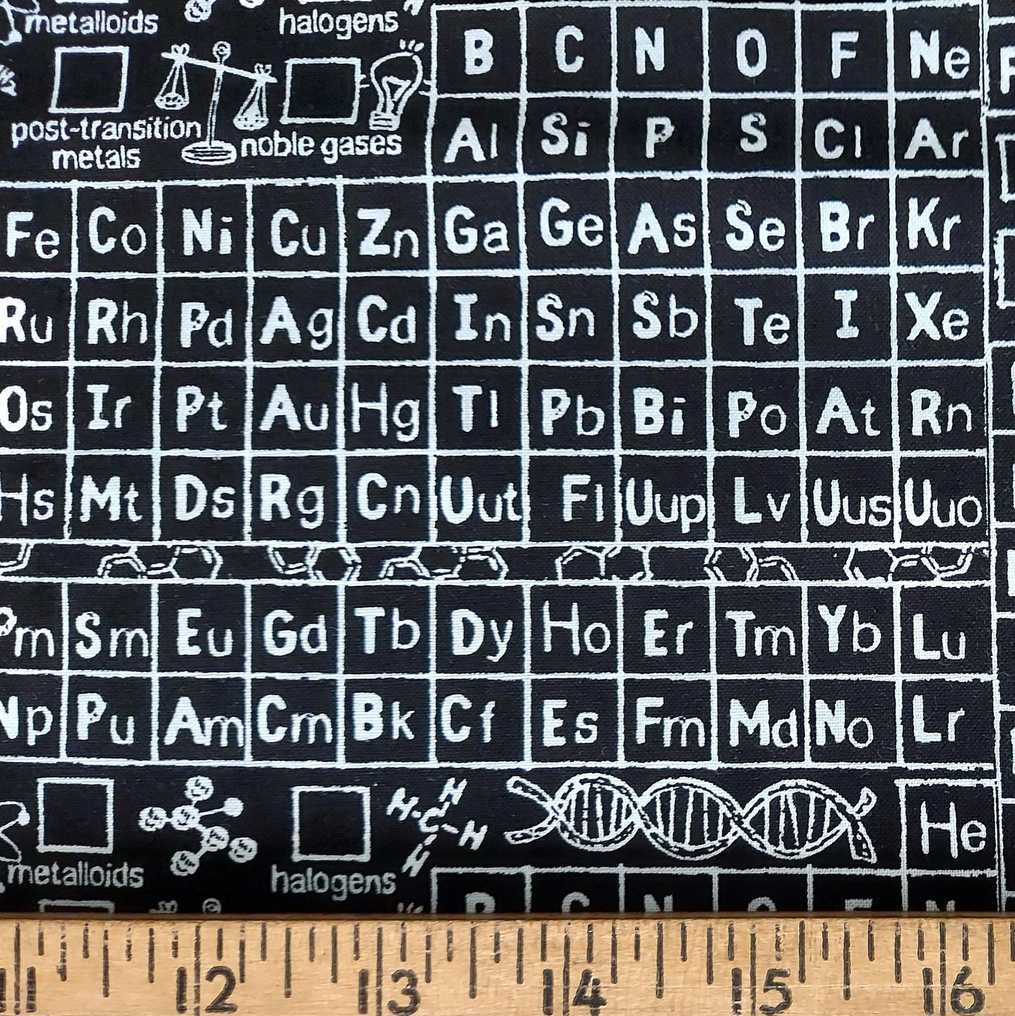 This quilting weight cotton fabric features and clean black chalkboard-like background with the periodic table elements printed in white in an all over print.