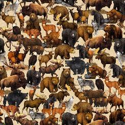 Lodge animals are rendered in painterly design and rich color in picture patches, allovers, and decorative stripes. The extra-large mountain landscape panels and textural coordinates can star on their own or come together for projects that all nature and animal enthusiasts will cherish. ©Dan Morris