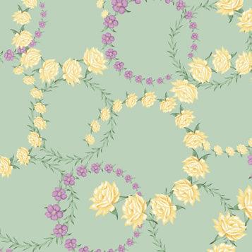This Cottage Market Circle Green fabric is perfect for adding a pop of cheerful charm to any quilting project! It's 100% cotton, with a soft green background and delicate pastel purple and yellow florals and vines that circle around in a delightful pattern. Sew something special with this Boundless fabric from the Cottage Market collection!