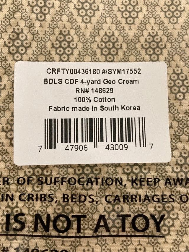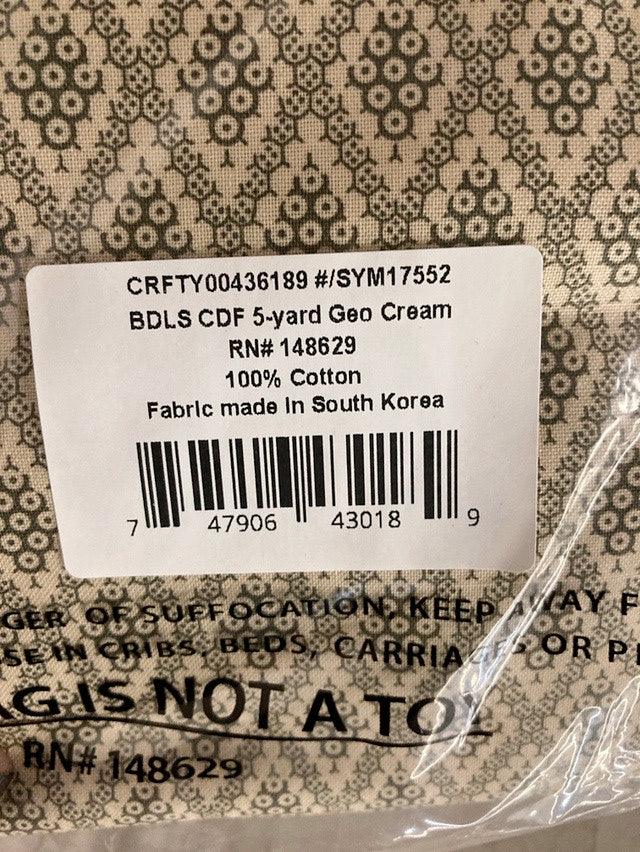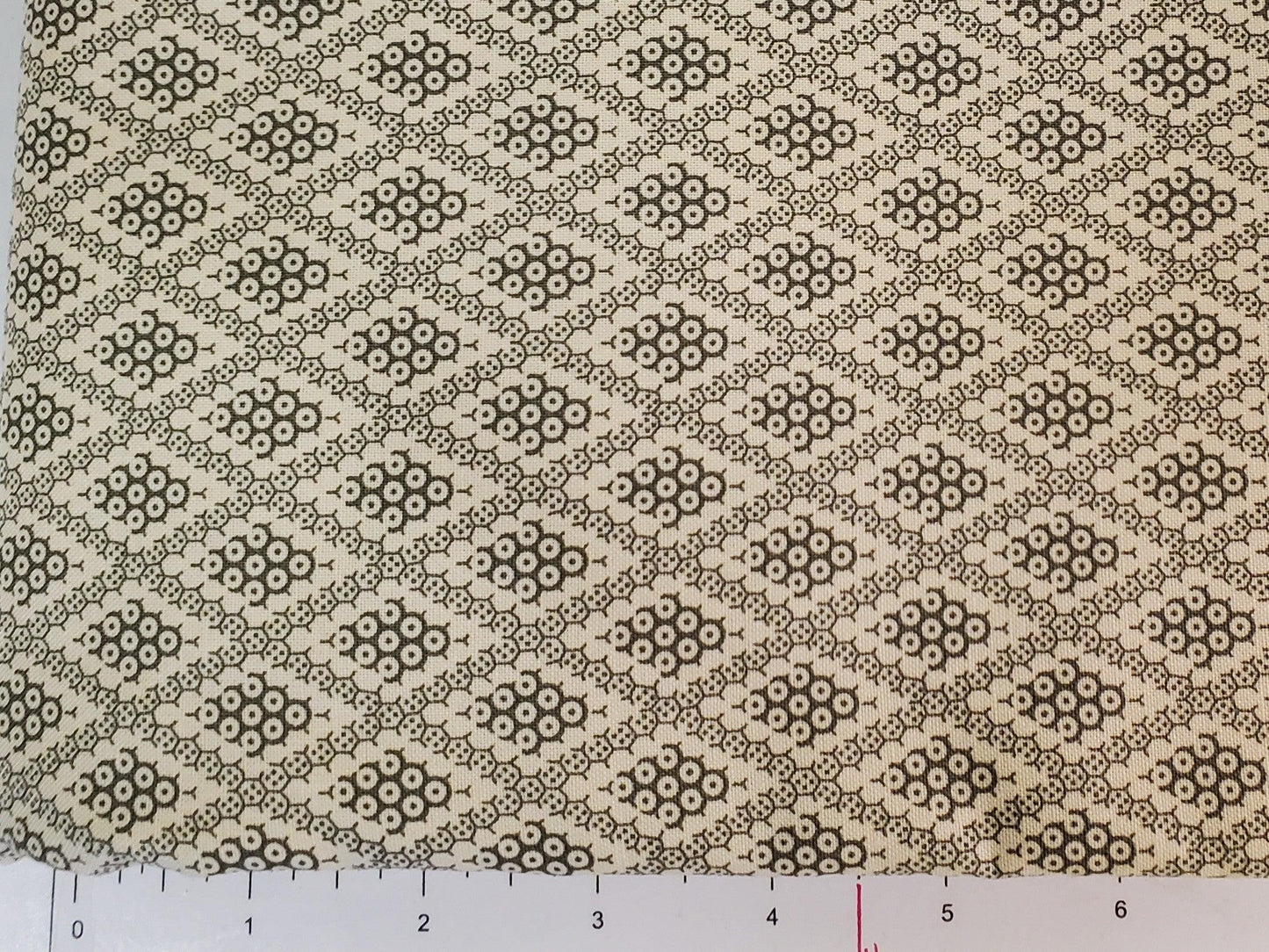 Introducing the Cour de Fleur Geo Cream from Boundless fabric, a stylish quilting fabric that will spruce up any project. This 100% cotton fabric features a beige background with circles, dots, and hexagons arranged in a diamond pattern, making it ideal for sashing and binding. Add a touch of elegance to your next quilting project with the Cour de Fleur Geo Cream.