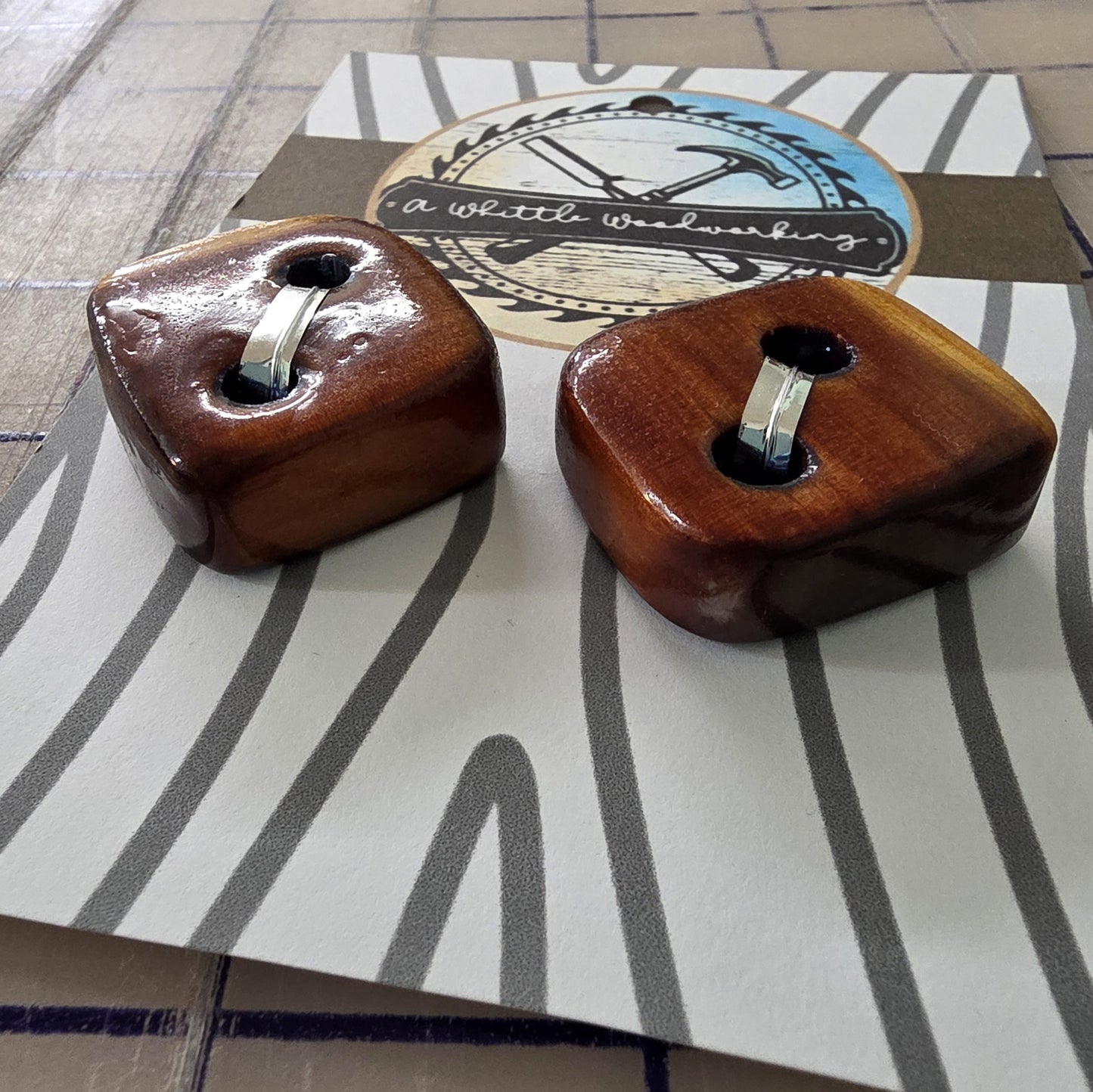 2 wood buttons, roughly 1 inch imperfect square, 3/8 inch thick. Perfect for shawls and outerwear. Made from cedar wood.