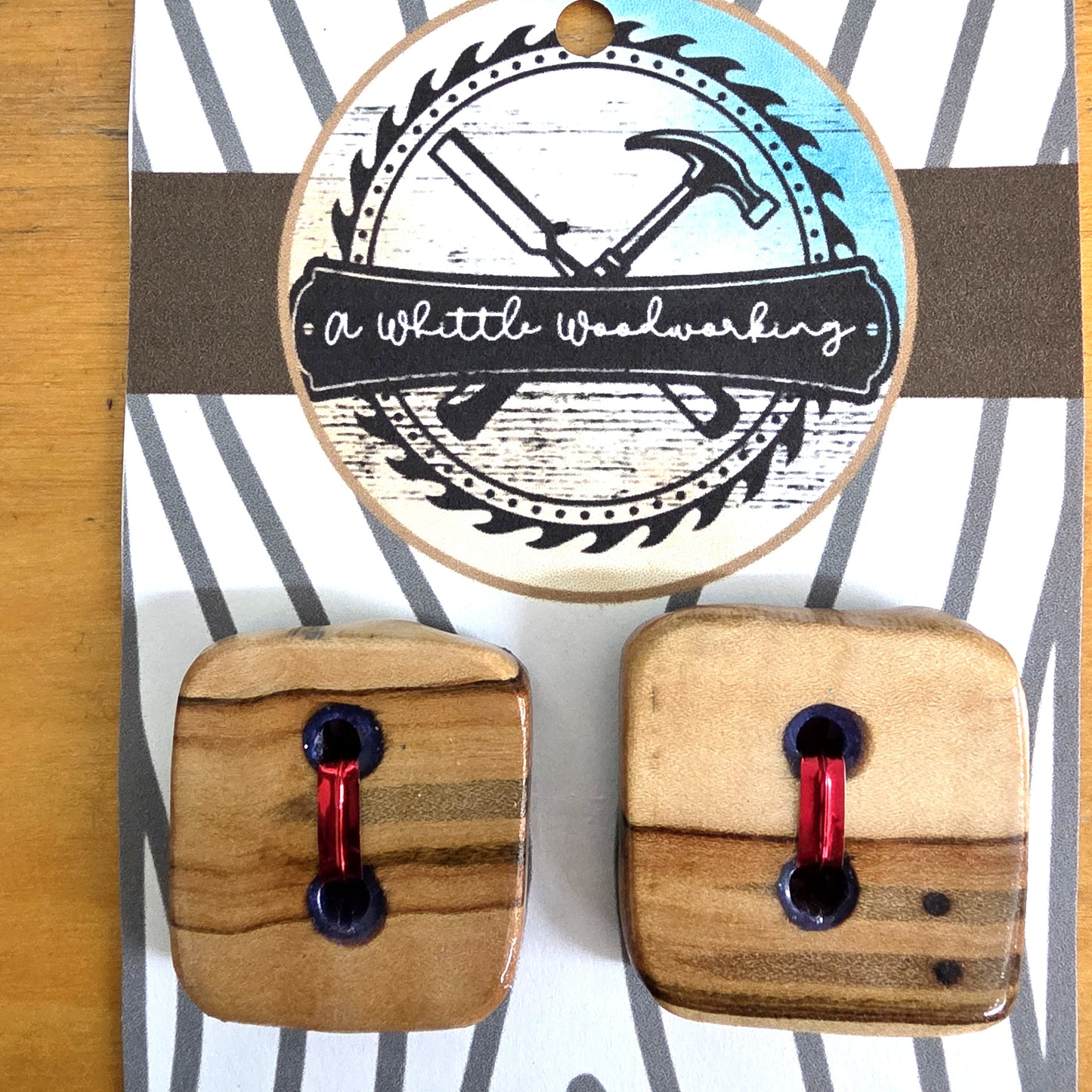 2 wood buttons, roughly 1 1/4 inch imperfect square, 1/4 inch thick.