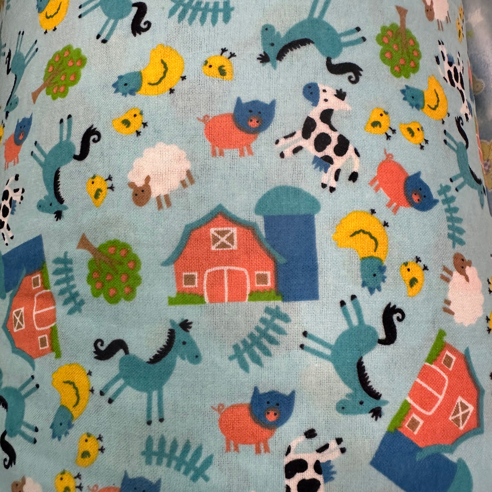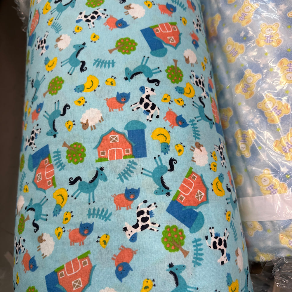 $35 Flannel Flat Fold: 5 Yards of Farm on Blue 44 inch 100% Cotton