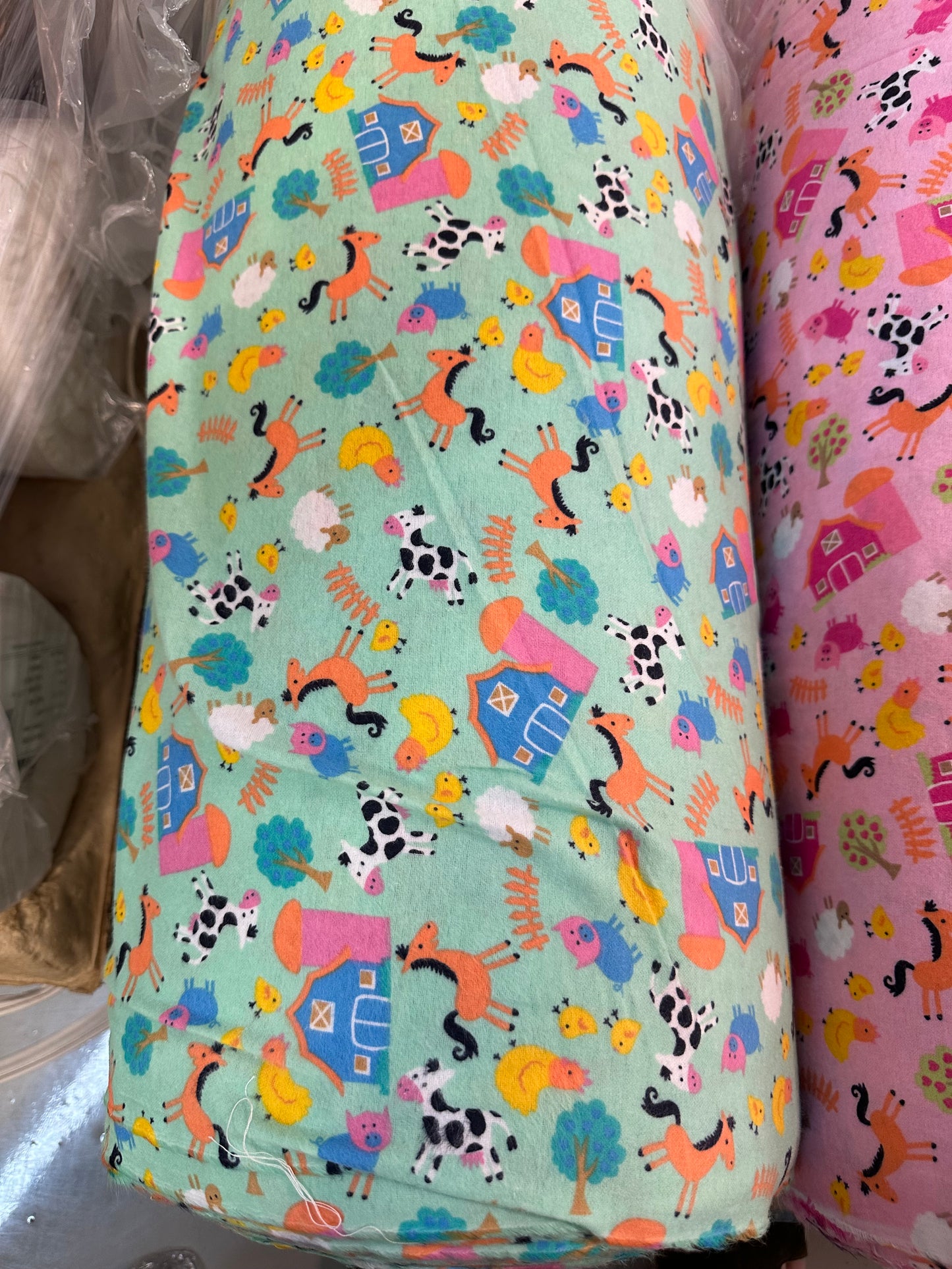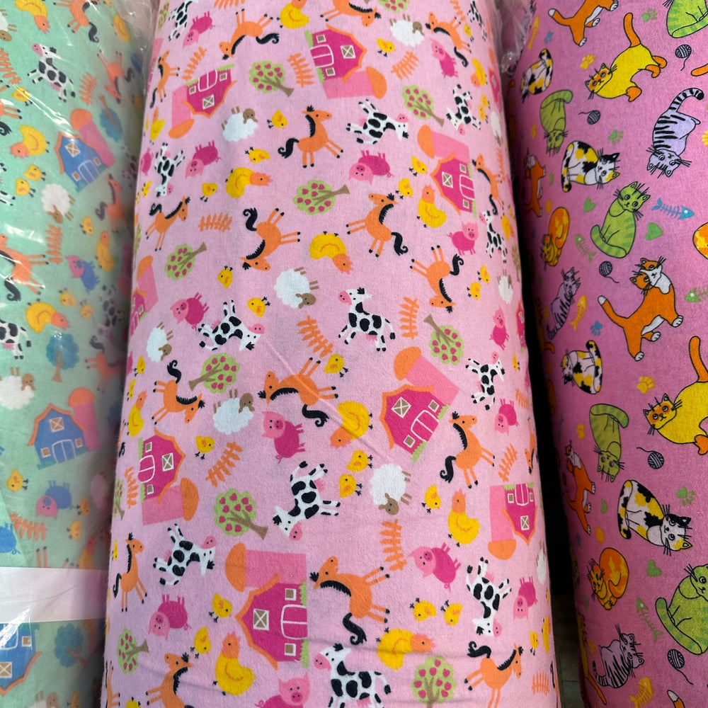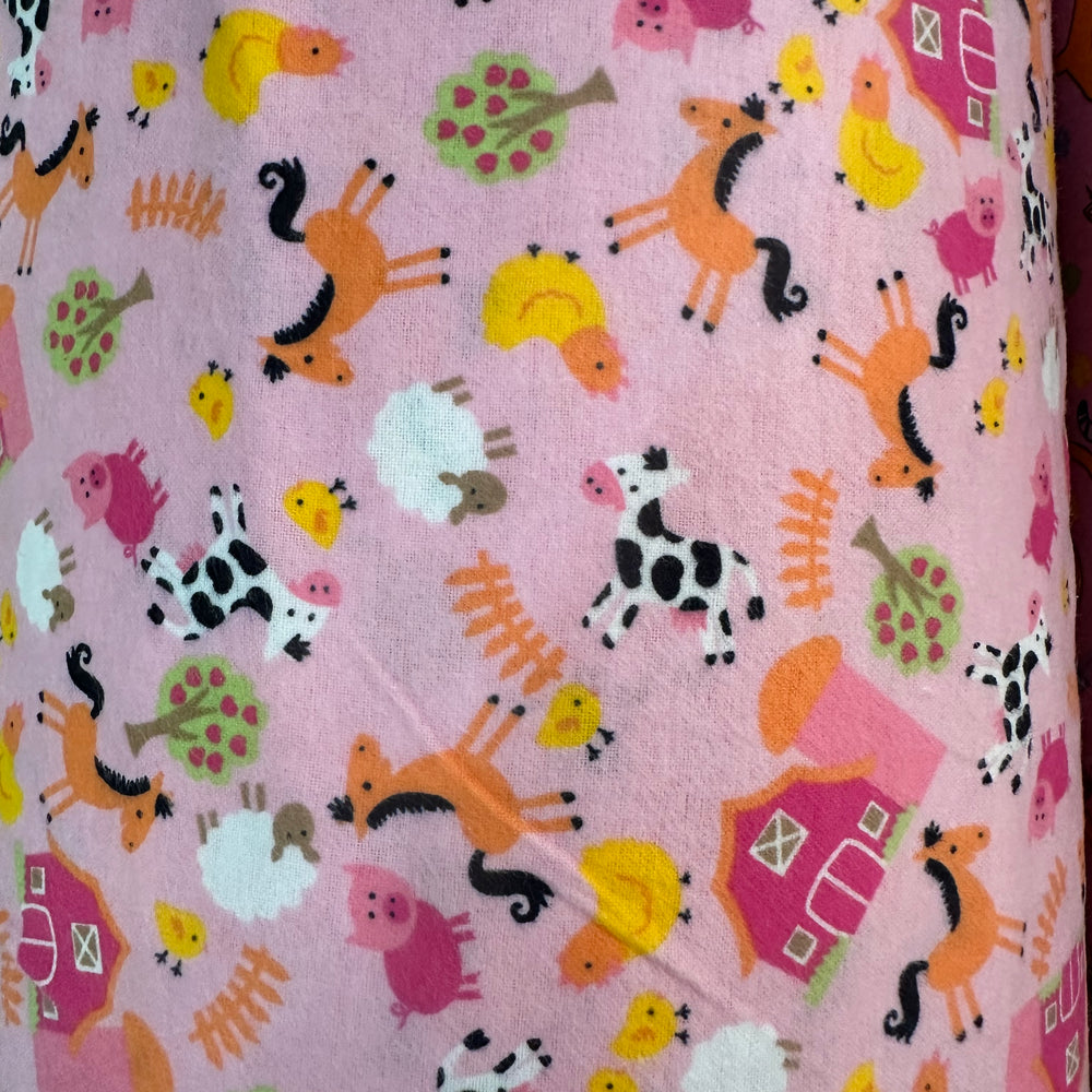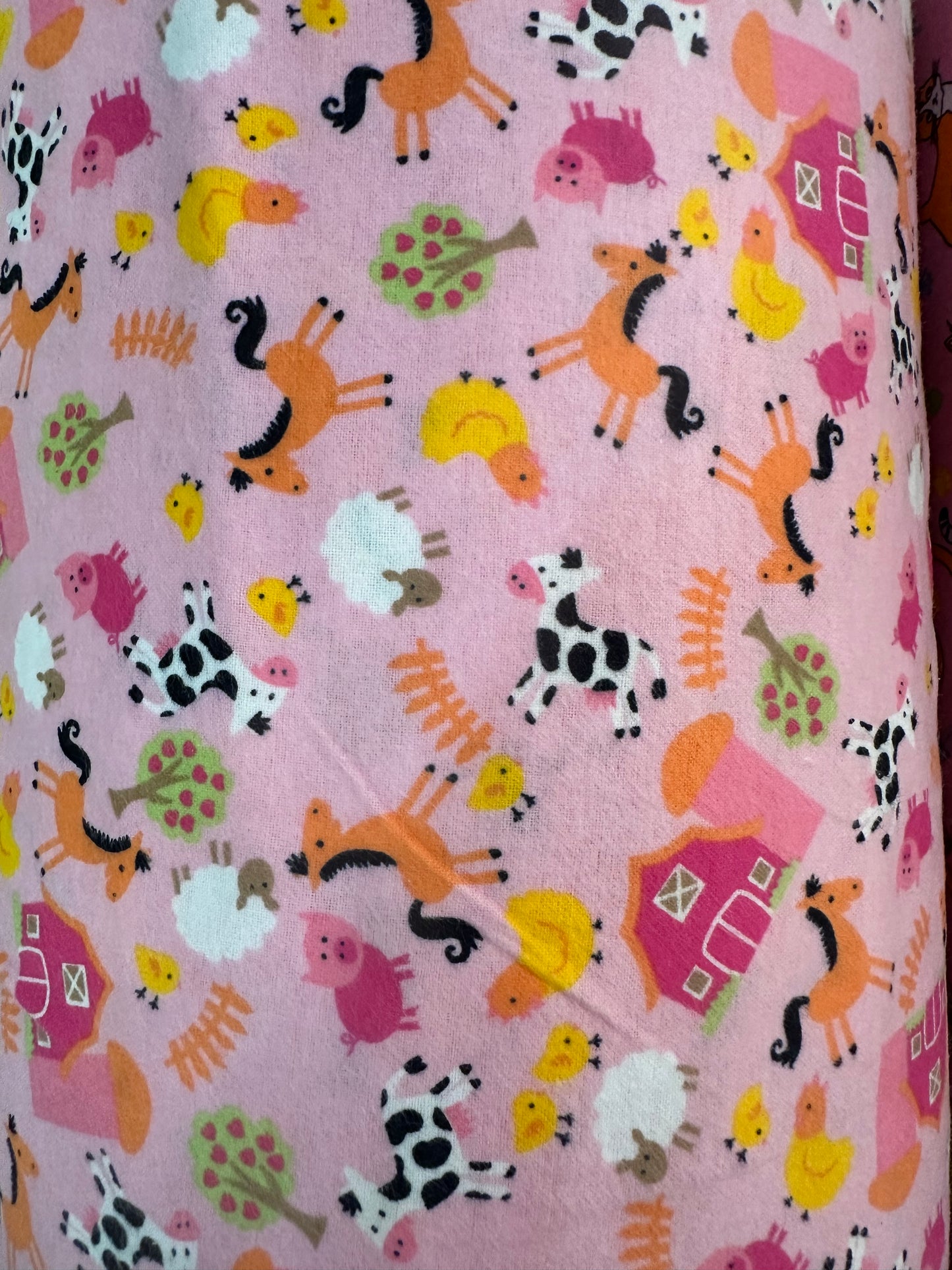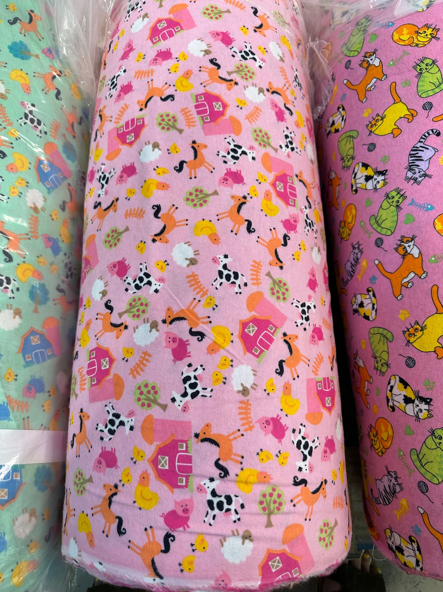 $35 Flannel Flat Fold: 5 Yards of Farm on Pink 44 inch 100% Cotton